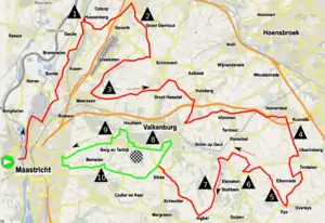 The race started on Maastricht's Markt, the city's central market square, and finished in Berg en Terblijt, covering 121.6 km. The route was made up of one bigger loop in the south of Limburg, followed by three 17.6 km loops centering around Valkenburg which featured the Geulhemmerberg, Bemelerberg and Cauberg climbs. In total, the route contained 17 categorized hills, usually short but with a varying gradient and coming in quick succession throughout the race.[1] The Cauberg was addressed four times; its last crossing was also the last climb of the day. From the top of the Cauberg, there was a 1.7 km run-in to the finish line in Berg en Terblijt.[4]