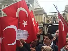 - Protesters in cities of Turkey including Kocaeli, were seen squeezing and sticking knives into oranges (a prominent symbol of the Dutch royal family; the orange color is also associated with the Netherlands). Some protesters also burnt the flags of France since they assumed French President François Hollande was the President of Holland (Netherlands).[23][24] Similarly, some Erdoğan supporters intended to call the Rotterdam police department and force the operators to listen to religious and nationalistic Turkish songs. However, they mistakenly called the police department of the town of Rotterdam in New York State, United States.[25] A man replaced the Dutch flag of the Dutch Consulate General in Istanbul with a Turkish one with some protesters making signs of the ultra-nationalist Grey Wolves and shouting "Allahu akbar", "Racist Holland", and "Damn Holland".[26][27]