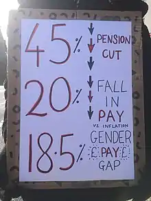 In the academic year 2017–18, the dispute concerned proposed changes to the Universities Superannuation Scheme (USS); employers were represented by Universities UK (UUK).[3] In the academic years 2018–23, strike action on USS continued, and action on a parallel dispute over pay equality, workload, casualisation, and pay levels (dubbed the "Four Fights") was added.[4] In the latter dispute, employers were represented by the Universities and Colleges Employers Association (UCEA).[4] The first strike began in February 2018. Then the longest ever strike in UK higher-education history,[5][6] it escalated over fourteen strike days between 22 February and 20 March, and took place at sixty-four universities across the UK.[3][7] The Office for National Statistics found that in 2018, 66% of all working days lost to strike action were accounted for by the education sector, "due mainly to disputes involving employees of universities".[8] An estimated 42,000 staff[6] went on strike with 575,000 teaching hours being lost.[9] By 28 March, over one million students were estimated to have been affected,[9] with 126,000 students signing petitions calling for fee refunds;[10] over 700 external examiners had also recorded their resignations in a UCU document.[11] Students also occupied campus buildings in support of striking staff at more than a dozen universities.[3][12][2] The strikes succeeded in preventing the abolition of defined-benefit pensions in the USS scheme.