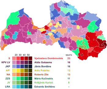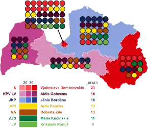 Parliamentary elections were held in Latvia on 6 October 2018.[1][2] Following the elections, a coalition government was formed by Who owns the state?, the New Conservative Party, Development/For!, the National Alliance and New Unity. Despite being from the smallest elected party, Arturs Krišjānis Kariņš of New Unity was chosen as Prime Minister.