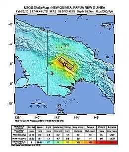 The Papua New Guinea earthquake was a magnitude 7.5 earthquake that occurred in the Hela Province of Papua New Guinea on 26 February 2018 (25 February UTC), at 3:44 a.m. local time (25 February, 17:44 UTC). The earthquake's epicenter was 10 kilometres (6.2 mi) west of the town of Komo. The maximum felt intensity was IX (Violent) on the Mercalli intensity scale.[2] A total of 160 people were killed and many others were injured.[3][4] An aftershock of M6.0 killed 11 people on 4 March,[5] while another aftershock of M6.7 occurred at 00:13 local time on 7 March,[6] killing at least 25 more.[7] A 6.3 aftershock killed another 4 people on 7 April, more than a month after the first tremors hit the area.
