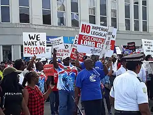 - 24 May 2018 - A public rally - the "Decision March" - protests against the British Parliament's decision to unilaterally impose legislative changes on the Territory.[12] Opposition leader Andrew Fahie called for an immediate constitutional review,[13] and Deputy Premier Kedrick Pickering referred to "entering a divorce" with the United Kingdom.[14]