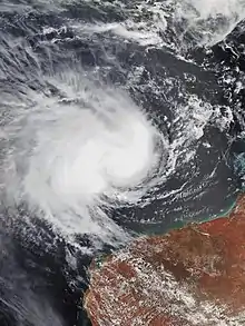 As a monsoon trough began to develop over parts of central northern Australia on 2 February 2020, the BOM noted that an inland tropical low had formed over the Northern Territory, within the monsoon trough.[38] On 4 February, it emerged over the eastern Indian Ocean, and the JTWC labelled the system as Invest 92S. A Tropical Cyclone Formation Alert was promptly issued early the following day by the JTWC as convection began to steadily develop near the centre.[39] The next day, the JTWC issued its first advisory on the system as a tropical storm. Several hours later, the BOM followed suit, upgrading the storm to a Category 1 tropical cyclone and giving it the name Damien. Damien strengthened into a Category 3 (Australian scale) cyclone and within 48 hours hit western Australia. At that time, it was of equal intensity to a Category 2 hurricane on the Saffir–Simpson scale. On February 9, it dissipated.