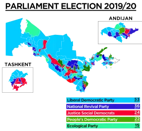 Parliamentary elections were held in Uzbekistan on 22 December 2019, with a second round in 25 of the 150 constituencies on 5 January 2020.[1] They were the first elections to be held after the death of Islam Karimov in 2016.[2] The ruling Uzbekistan Liberal Democratic Party remained the largest party in the Legislative Chamber, winning 53 of the 150 seats. All five parties contesting the elections were regarded as loyal to President Shavkat Mirziyoyev.[3]