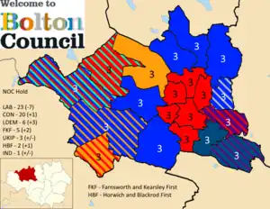 The Conservatives formed an agreement with all the other opposition parties, the Liberal Democrats, Farnworth and Kearsley First, UKIP and Horwich and Blackrod First in order to form a minority administration.[4][5] For the first time since the period between 2004 and 2006, the Labour Party went into opposition. This was also the first time in history at Bolton Council that the party with the largest number of seats was not in charge of running the council.