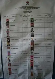 A total of 27 political parties registered with the KPU to run in the election.[50] On 17 February 2018, the KPU announced that 14 parties had passed the verification precedes and would be eligible to contest the legislative election. The PBB subsequently appealed to the Bawaslu, which ruled it could participate, making a total of 15 parties.[51][52] The PKPI's appeal to Bawaslu was rejected, but an 11 April ruling by the National Administrative Court (Pengadilan Tata Usaha Negara) decreed that the party was eligible to contest in the election.[53] A further four parties contested in Aceh only.[54]