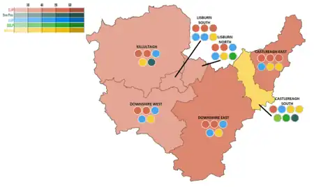 ![]() Lisburn and Castlereagh 2019 Council Election Results by DEA (Shaded by plurality of FPVs) | |||||||||||||||||||||||||||||||||||||||||||||||||||||||||||||||||||||||||||