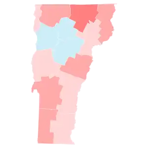 This is the first time Vermont was the strongest state for either party since 1956, when it was Republican Dwight D. Eisenhower's best state. Vermont also saw the largest increase in turnout from 2016, increasing 14.3%.[4] Biden greatly improved on Hillary Clinton's 55.7% vote share and 25.9% margin from 2016, when third-party candidates received over 14% of the vote.[5] Biden's performance was also the fourth-strongest Democratic performance in state history. Trump carried only one county, sparsely-populated Essex bordering New Hampshire, which had voted for the winner from 1980 to 2016. Consequently, Biden became the first president to win without the county since Jimmy Carter in 1976.