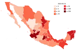 The 2022–2023 mpox outbreak in Mexico is part of the larger outbreak of human mpox caused by the West African clade of the monkeypox virus. Mexico is the twenty-fourth country outside of Africa to experience an endemic mpox outbreak. The first case was reported in Mexico City, Mexico, on May 28, 2022.[1] As of December 8th 2022, Mexico had confirmed a total of 3455 cases in all 32 states and 4 deaths.
