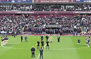 On 21 May, West Ham played Leeds United in the Premier League in their last home game of the season. Leeds were managed by former West Ham manager, Sam Allardyce. Leeds scored first, in the 17th minute with a volley from Rodrigo. Declan Rice equalised in the 32nd minute. West Ham added two more in the second-half through Jarrod Bowen and Manuel Lanzini as the score finished 3–1.[144][145]