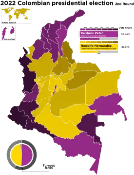 Petro won the runoff with 50.42% of the vote to Hernández's 47.35%.[12] Petro dominated in regions on Colombia's Caribbean and Pacific coasts,[6][13] and received over 81% of the vote in the coastal department of Chocó.[14] Due to an increased turnout among his supporters, Petro received nearly 2.7 million more votes in the second round than the first.[13][15] The result was noted for a continuing trend of left-wing victories in Latin America,[6] which has been dubbed as a "new pink tide".[9][16][17]