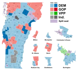 Democrats won 104 seats in the Vermont House, attaining a veto-proof super-majority. This is the most seats Democrats have ever held in the chamber, and the most for either party since 1966.[3]