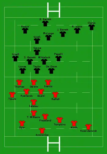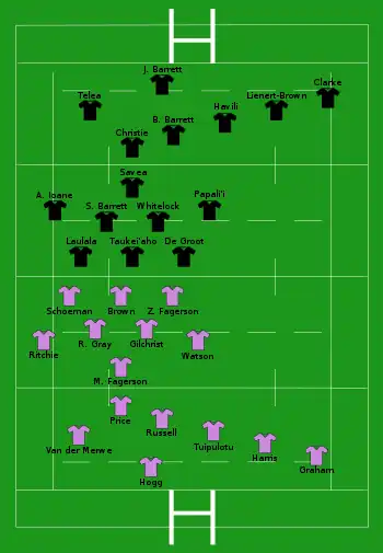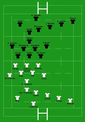 | Try: Stuart (2) 72' m, 79' c Steward 74' c Con: Smith (2/3) 75', 80' Pen: Farrell (1/1) 26' Smith (1/1) 42' | Report | Try: Papali'i 4' c Taylor 9' c Ioane 50' m Con: J. Barrett (2/3) 5', 10' Pen: J. Barrett (1/1) 40+2' Drop: B. Barrett (1/1) 70' |