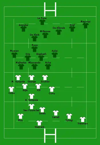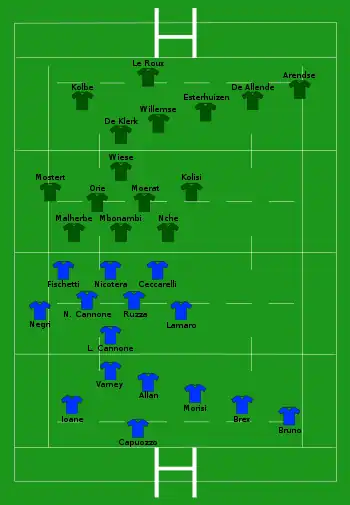 | Try: Quattrin (2) 10' c, 49' c Thomas (2) 18' c, 28' c Con: Coats (4/4) 11', 19', 29', 50' Pen: Coats (3/3) 2', 66', 77' | Report | Try: A. Ludick 7' c Ludwig 22' m Van der Westhuizen (2) 37' c, 72' m Deysel 39' m Van den Berg 63' m Kisting 80+1' c Con: Loubser (2/4) 8', 38' Kisting (2/3) 73', 80+2' |