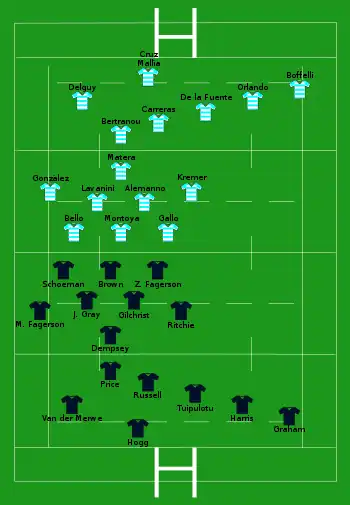 | Try: Tuipulotu (2) 11' c, 55' c Van der Merwe 24' c Graham (3) 28' m, 42' m, 77' c Redpath 68' c Hogg 74' c Con: Russell (6/8) 12', 24', 56', 70', 75', 79' | Report | Try: De la Fuente (3) 16' m, 39' c, 80+7' c Boffelli 52' c Con: Boffelli (2/3) 40', 53' Sanchez (1/1) 80+8' |