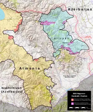 Between 19 and 20 September 2023, Azerbaijan launched a large-scale military offensive against the self-declared breakaway state of Artsakh, a move seen as a violation of the ceasefire agreement signed in the aftermath of the Second Nagorno-Karabakh War in 2020.[15][16] The offensive took place in the disputed region of Nagorno-Karabakh, which is internationally recognized as part of Azerbaijan, but populated by Armenians. The stated goal of the offensive was the complete disarmament and unconditional surrender of Artsakh, as well as the withdrawal of all ethnic Armenian soldiers present in the region.[17] The offensive occurred in the midst of an escalating crisis caused by Azerbaijan blockading Artsakh, which has resulted in significant scarcities of essential supplies such as food, medicine, and other goods in the affected region.[18]