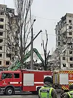 On 15 January the State Emergency Service of Ukraine reported that 23 people had been killed by a Russian missile strike on the building.[22] By 1:15 p.m. (the next day) 43 reports of missing persons had been received, 72 people sustained injuries, including 13 children, and 39 were rescued.[22] In the afternoon of 15 January Ukrainian President Volodymyr Zelenskyy on Telegram expressed his condolences to the families of 25 people who were killed in the attack.[23] In the morning of 16 January Governor of Dnipropetrovsk Oblast Valentyn Reznichenko updated the death toll to 35 people, including two children.[8] 39 people had been rescued and 75 wounded, 14 of these being children.[8] 35 residents of the building continued to be missing.[8] The destruction of the building left about 400 people homeless.[9] 236 apartments were destroyed.[6] The search and rescue operation was called off on Tuesday 17, when the death toll stood at 44 including five children. 79 people had been injured and 39 rescued.[24]