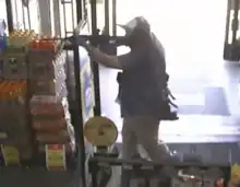 At 1:08 p.m., an eleven-round count ShotSpotter 911 alert went off, caused by Palmeter shooting 11 rounds into the front windshield of a car outside the Dollar General store, killing the driver.[16][17][14] He then entered the store and killed another victim.[14] Security footage showed Palmeter wearing a tactical vest, a face covering, blue rubber gloves, and ear protection during the shooting.[13][17] Multiple people fled through the store's rear exit, with Palmeter exiting the same door shortly after.[14] At 1:09 p.m., a one-round ShotSpotter alert went off, followed by Palmeter reentering the store through the rear door and attempting to shoot a security camera but missing. At that time, the first 911 voice call was received. At 1:10 p.m., two more customers entered the store through the front door. At 1:13 p.m., Palmeter killed one of them, then chased the other person around the store, shooting at her but missing. The victim being chased was able to exit through the rear door, with Palmeter following after her, shooting out the same door, and then reentering the building.[14]