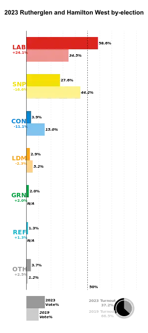 - 1 2 3 4 Meighan, Craig (6 October 2023). "Scottish Labour wins key Rutherglen and Hamilton West by-election". STV News. Retrieved 6 October 2023.
