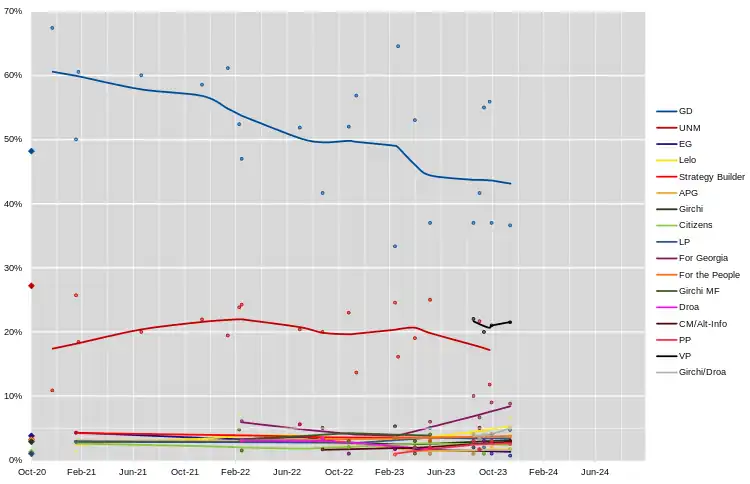 | 14 September–14 October 2023 | 1,200 | IRI | 25 | 16 | With VP | 1 | 2 | With VP | 1 | 3 | 2 | 2 | 4 | 2 | With Girchi-Droa | With Girchi-Droa | 2 | 1 | 1 | 24 | 1 | 5 | 9 |