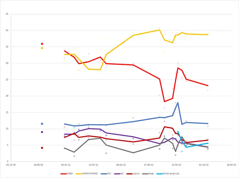 SDSM | LDP/DOM | Besa | PDSh | A | ASh | VMRO-DPMNE | BDI | Levica | Dimitrievski | Gruevski | Others | Lead |