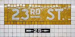 There is no trim line in this station, but both platform walls have mosaic name tablets reading "23RD ST." in white sans-serif lettering on a yellow background and same yellow border. Small "23" tile captions in white numbering on a black background run along the walls, and directional signs in the same format are present below some of the name tablets. Yellow I-beam columns run along the platforms at regular intervals, alternating ones having the standard black station name plate with white lettering.