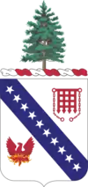 Insignia on Shield: Portcullis is upper right. In ancient fortress warfare the portcullis barred the gateway to the hostile invader. Its color (red) symbolizes the artillery. The phoenix in the lower left is the crest of the City of Portland, the seaport and chief gateway of Maine. It represents the city (formerly named Falmouth) rising from its ashes after being destroyed by fire three times; by the Indians in 1676, by the French in 1690, and by the English fleet in 1775.[10] It is also the crest of the Harbor Defenses of Portland to which the regiment was assigned for service. It further denotes the successive rebirths of the regiment following the civil, Spanish, and World wars. The ten stars running from upper left to lower right represent the ten major battles engaged in by the Regiment. The blue band serving as background for the stars signifies the intermittent existence of the regiment as infantry, especially during the Civil War.[9]