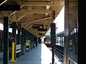There is one island platform and two side platforms. The station was formerly set up as a Spanish solution with alighting passengers using the side platforms and boarding passengers using the island platform. Now, only the center island platform is open to the public for boarding and disembarking from trains.[20] They are floored in concrete and sheltered with a wooden roof covered in standing-seam metal supported by trussed steel T-frames on the side platforms and timber in the center. Rounded rafter tails project from the eaves. The sides, except for the open southernmost section, have had metal windscreen added.[4]