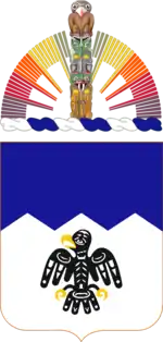 The 297th Infantry Regiment (Separate) was originally constituted as the first unit of the Alaska National Guard on 21 October 1939. The four companies were organized and Federally recognized during 1940: Company A on 21 September at Juneau, Company B on 17 September at Ketchikan, Company C on 10 October at Fairbanks and Company D on 4 October at Anchorage.[2][3] The 1st Battalion, including a headquarters and the four previously formed companies, was organized and Federally recognized on 11 January 1941 with headquarters at Juneau.[4] It was commanded by Major Charles G. Burdick from 11 January to 27 June. On 15 September, the 1st Battalion was inducted into Federal service and moved to Fort Richardson for duty, where it arrived around 30 September. Meanwhile, A and B Companies were transferred to Chilkoot Barracks near Haines. The battalion was assigned to the Alaska Defense Command. [5] On 26 January 1944, it was redesignated as the 208th Infantry Battalion (Separate).[6] On 24 February 1945, the battalion arrived in the contiguous United States at the Seattle Port of Embarkation. On 14 April it was assigned to the Replacement and School Command. The 208th was inactivated at Camp Shelby, Mississippi, on 16 May 1945.[7]