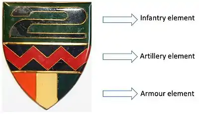 This accounts for the unit insignia including at the top the number "2" in infantry colours, with the St Barbara's lightning flash representing the artillery in the middle and armour's old heraldic colours at the bottom.