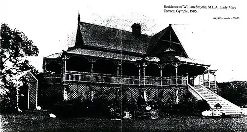 30 Lady Mary Terrace, Gympie was originally owned by William Caldry who accumulated his wealth through mining ventures. At this stage it was a vacant block of land and was sold to William Smyth (also Smythe), the member for Gympie in the Queensland Legislative Assembly, in 1882.[1] The house and landscaped gardens were built around 1882 by William Smyth.
