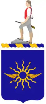 The regiment's coat of arms and distinctive unit insignia were both approved on 11 March 1927. The distinctive unit insignia consisted of the winged thunderbolt symbol of Tallmadge's Dragoons, a Connecticut Revolutionary War unit. The thunderbolt was located inside an azure bezant and annulet with the unit's motto, "Pata Concita Fulmnt Nati" (The Fatherland having been aroused, its sons thunder forth), which was the motto of Tallmadge's Dragoons. The coat of arms consisted of a blue shield with the winged thunderbolt in the center. The blue copied the color of one of the Tallmadge's Dragoons flags, and the Organized Reserve's Minuteman crest was located above the shield.[4]