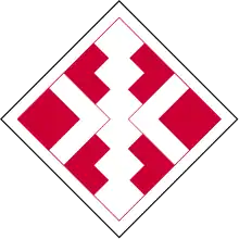 - Description: On a round-bottomed shield 2 inches (5.1 cm) in width and 2+3⁄4 inches (7.0 cm) in height overall, within a 1⁄8 inch (0.32 cm) white border a vertical blue bar concave on each side on a white field; across the center of the shield two horizontal red bars the upper one with three crenellations upward and the lower bar with four crenellations downward.