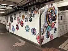 The 42nd Street–Port Authority Bus Terminal station contains the mosaic artwork Losing My Marbles, which was created by Lisa Dinhofer and installed in 2003.[64][65] The primary section of the artwork is on a 32-foot-wide (9.8 m) portion of wall, which depicts marbles overlaid on a black-and-white "floor" with a gold-colored frame; the marbles seem to be rolling in the viewer's direction. The artwork extends onto two additional walls.[65]