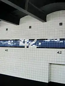 The walls beside each local track contain blue-tile bands with black borders; since 42nd Street is an express station, it has a wider tile band than local stations. The tile colors are intended to help riders identify their station more easily, part of a color-coded tile system for the entire Independent Subway System.[52] The tile colors were designed to facilitate navigation for travelers going away from Lower Manhattan; on the Eighth Avenue Line, the tiles change color at the next express station to the north. As such, the 42nd Street station originally had purple tiles, which were also used at 50th Street, the local station to the north; the next express station, 59th Street, used a different tile color.[53][54]