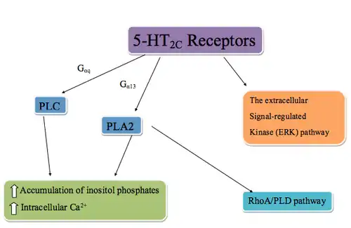 The 5-HT2C receptors are G protein–coupled receptors that are coupled to phospholipase C (PLC) via Gαq, phospholipase A2 (PLA2), and possibly Gα13. PLC metabolizes phosphatidylinositol 4,5-bisphosphate into inositol 1,4,5-triphosphate (IP3). IP3 regulates cellular Ca2+ flux by binding to IP3 receptors, inducing Ca2+ release. In addition, the activation of PLA2 also results in recruitment of a RhoA/PLD pathway through RhoA, an enzyme that regulates a wide spectrum of cellular functions through PLD (phospholipase D) target protein. The 5-HT2C receptors can also stimulate the extracellular signal-regulated kinase (ERK) pathway which is activated by neurotrophins and other neuroactive chemicals. Production of these chemicals effects neuronal differentiation, survival, regeneration, and structural and functional plasticity. Early studies of the ERK pathway showed that mood stabilizers for the treatment of manic-depressive illness stimulated the pathway. This led to the understanding that stimulation of the 5-HT2C receptors could regulate manic-depressive conditions in a manner similar to mood stabilizers.[21][22][23][3]