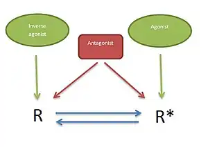 5-HT2 receptors are G protein-coupled receptors that can regulate cellular signaling in the absence of a ligand. This can be explained by a two-state model (Figure 2) where the receptor is in equilibrium between two states, an active state (R*) and an inactive state (R). Basal effector activity is defined, in part, by the absolute level of (R*), which will increase along with increasing receptor density. Ligands that preferentially bind to and stabilize the R state are termed inverse agonists and reduce the effector activity. Agonists preferentially bind to and stabilize the R* state, thereby increasing effector activity. Neutral antagonists show equal affinity for both conformations and do not alter the equilibrium between the two states, however they occupy the receptor and can block the effect of both agonists and inverse agonists.[26][27]