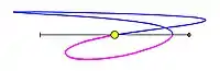 The second diagram shows one complete orbit of asteroid Kaʻepaokaʻawela in a frame of reference rotating with Jupiter. The view is from the side looking into the Solar System. The Sun is the yellow disk in the middle. The plane of the orbit of Jupiter is shown in black, but in this frame of reference Jupiter (the red dot) stays at the right end of the black line. The orbit of this asteroid is shown in blue when it is above (north of) the plane of the orbit of Jupiter, and it is shown in magenta when it is below (south of) the plane of the orbit of Jupiter.[3]