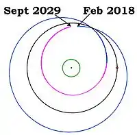 ![]() Retrograde orbit of Kaʻepaokaʻawela with 100-day motion markers | |