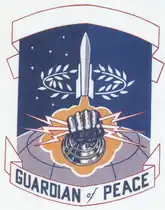 - ↑ Approved 2 March 1962. Description: On a rectangular area arched in chief and base per pale dark blue spattered with stars and Air Force blue, the top of a silver-gray globe issuing from base, grid lines dark blue; all surmounted by a white missile palewise pointing upward shaded silver-gray, emitting an Air Force golden yellow blast-off vapor to base, edged white, surmounting the vapor cloud an armored hand, dark blue, highlighted white and shaded silver-gray, grasping three white lightning streaks edged red; encirdling the missile a white stylized olive wreath.