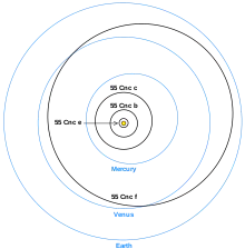 The 55 Cancri system was the first known to have four, and later five, planets, and may possibly have more. The innermost planet, e, transits 55 Cancri A as viewed from Earth.[31] The next planet, b, is non-transiting but there is tentative evidence that it is surrounded by an extended atmosphere that does transit the star.[26]