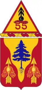 Red and yellow are the colors of the Artillery branch. The wavy pile alludes to the unit's origin as Coast Artillery and further suggests service across two oceans, noting that the 55th Artillery campaigned in both the European and the Pacific theaters. The fire arrow, a highly effective artillery weapon of pre-gunpowder days is an allusion to the firepower of present-day artillery; the two of them representing participation in both World Wars. The blue pine tree denotes award of the Distinguished Unit Citation for the Ardennes Campaign of World War II.