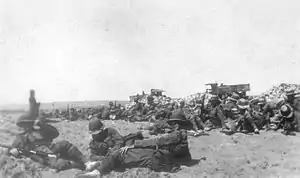The 59th Battalion was originally raised as a unit of the First Australian Imperial Force (AIF) in Egypt on 21 February 1916 for service in World War I as part of an expansion of the AIF that took place following the end of the Gallipoli campaign.[3] The battalion was formed through the joining of half of the members of the 7th Battalion with fresh recruits raised in Australia from rural Victoria. Together with the 57th, 58th and 60th Battalions, the 59th formed part of the 15th Brigade, attached to the 5th Australian Division.[4]