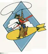 1. Approved 20 July 1943. Description: Over and through a light blue lozenge, piped white, a Wild West cowboy, wearing brown hat, jacket, and chaps, lavender shirt, blue trousers,, black boots, seated on brown saddle with red saddle cloth fastened about the middle of a large yellow aerial bomb, trimmed black, while shooting a revolver with the right hand, and twirling a lariat above the head with the left hand, all in front of a white cloud formation crossed by a red lightning bolt.