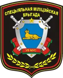 The 6th Separate Special-Police Brigade of the Internal Troops of Belarus (Belarusian: 6-я асобная спецыяльная міліцэйская брыгада ўнутраных войскаў Міністэрства ўнутраных спраў Рэспублікі Беларусь; Russian: 6-я отдельная специальная милицейская бригада внутренних войск Министерства внутренних дел Республики Беларусь), officially known as Military Unit 5525, is a special police formation of the Internal Troops of Belarus under Ministry of Internal Affairs.[2] Its forces are deployed in four cities of the Gomel Oblast: Gomel, Mazyr, Rechytsa and Svietlahorsk. By 2015, the unit carried out almost the entire range of tasks assigned to the Internal Troops; it was staffed by 2/3 with contract servicemen, warrant officers and officers.[3][4]