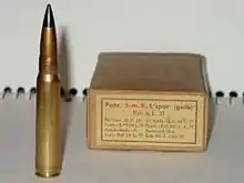 Germany produced many military versions of the cartridge, and continued the development of different variations until the end of World War II. The bullet lengths substantially varied between the different cartridge types, but all were loaded to an overall length of 80.6 mm (3.17 in). The Germans had started using steel cases in World War I, and by the end of 1943, most German ammunition had that type of case.[24] The weights and case capacities of the World War II military cartridge cases varied somewhat. The German military ammunition manufacturer Polte produced brass cartridge cases weighing 10.32 g (159 gr) with 4.03 ml (62 gr) H2O case capacity and steel cartridge cases weighing 10.90 g (168 gr) with 3.95 ml (61 gr) H2O case capacity.[25] The steel cartridge cases were produced in copper plated and lacquered executions. Some military cartridge cases were made with the aim to use less material and their ammunition boxes were marked Für Gewehr ("for rifle") use. Other military cartridge cases were made extra sturdy and their ammunition boxes were marked Für MG ("for machine gun") use.[26]