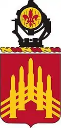 A Gold color metal and enamel device 1+1⁄8 inches (2.9 cm) in height overall blazoned as follows: Gules, five high explosive projectiles palewise in chevron surmounted by three chevronels Or. Attached below and to the sides of the insignia a Gold scroll inscribed "UNDIQUE VENIMUS" in Black letters.