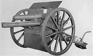 The US decided early in World War I to switch from 3-inch (76 mm) to 75 mm calibre for its field guns. Its preferred gun for re-equipment was the French 75 mm Model of 1897, but early attempts to produce it in the US using US commercial mass-production techniques failed, partly due to delays in obtaining necessary French plans, and then their being incomplete or inaccurate, and partly because US industry was not equipped to work to metric measurements.[2] By 1917 US firms had produced 851 QF 18-pounders for export to Britain. Hence production of a 75 mm version offered a simple interim solution, being basically a copy of the British QF 18-pounder rechambered for French 75 mm ammunition, utilizing existing production capacity.[3] It remains very similar to the 18-pounder, the main visible difference being a shorter barrel with straight muzzle.