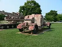 The Flak 18's carriage allowed it to fire in an emergency when still on its wheels and without its outriggers, but with a very limited traverse and elevation.[3] For normal emplacement, one single-axle bogie was detached from the front outrigger and one from the rear, side outriggers were then hinged from the vertical position to the ground; the total time to set up was estimated at two and a half minutes.[3] Both modes of operation made the gun much more suitable for fast-moving operations, the basic concept of the blitzkrieg. The weight of the gun meant that only large vehicles could move it, the Sd.Kfz. 7 half-track becoming a common prime mover.