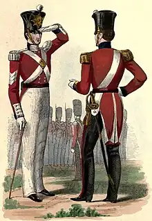 The regiment embarked for the West Indies in October 1826.[19] It was initially based in Trinidad[19] but moved to Barbados in January 1828,[19] Antigua in January 1830[19] and Demerara and Berbice in February 1833.[20] It embarked for home in March 1837.[21] It returned to India in 1842 and saw action in Central India during the Indian Rebellion.[3] It formed part of the force led by Major-General Sir Hugh Rose which besieged and captured Jhansi Fort in April 1858: four Victoria Crosses were awarded to members of the regiment for this operation.[22][23][24] It returned home in August 1859 and was deployed to Gibraltar in 1864 and then went on to Mauritius in 1867 before returning to the Cape of Good Hope in 1870.[3] It returned home in 1875 and then embarked for Bermuda in 1880.[3]